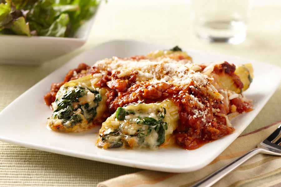 Mr. E’s Garden Veggie Cottage Cheese adds a flavorful touch to this savory stuffed manicotti. Because the dish is assembled a day before baking, it’s ideal for busy schedules, but is also special enough to “wow” guests.